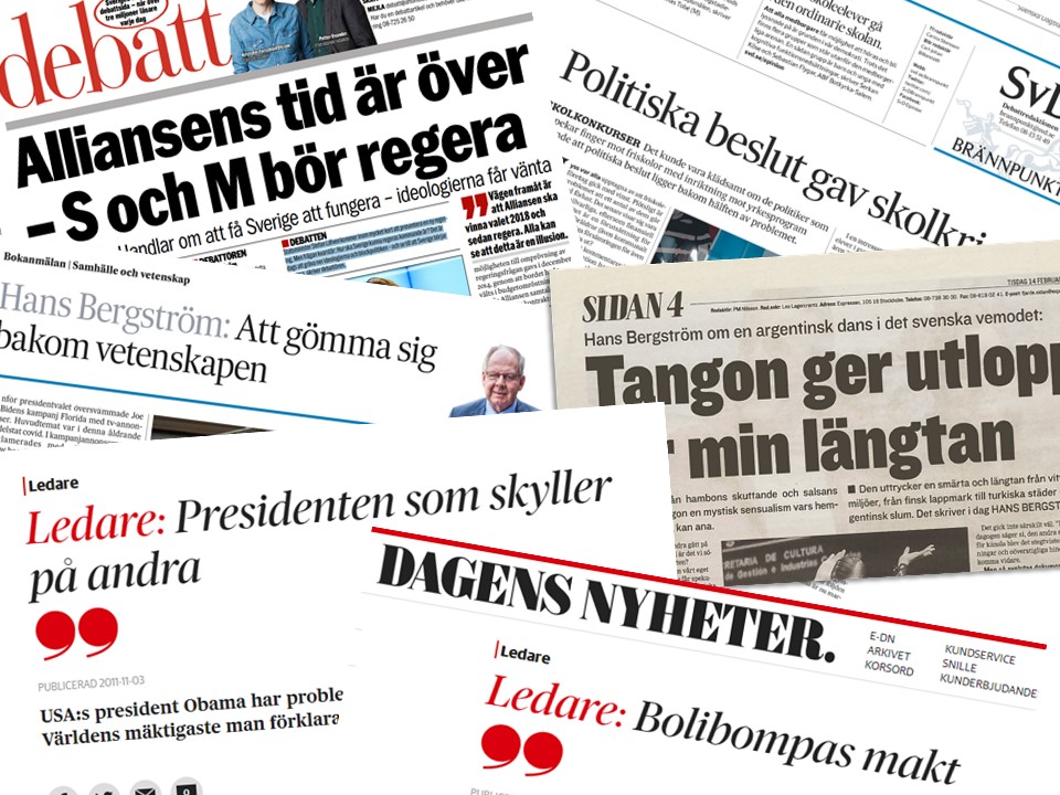 Debattinlägg, ledartexter, dagsbetraktelser… Som politisk opinionsbildare, samhällsdebattör och dessutom chefredaktör i omgångar har Hans varit – och är – en aktiv röst i svensk dagspress. Här finns ett stort urval av hans signerade texter. Vill du se texter för en specifik tidning eller ämne? Klicka då på namnet nedan.